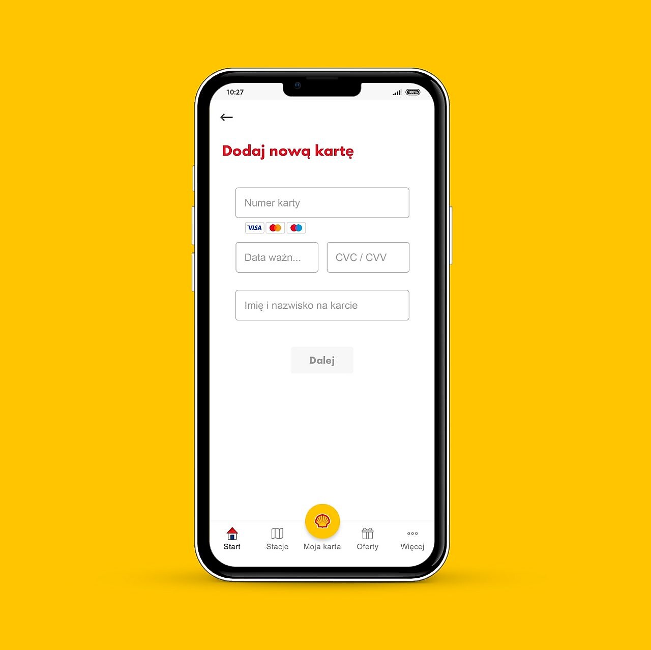 Aplikacja rozpoznaje, na której stacji Shell się znajdujesz. Jeśli w pobliżu znajduje się inna stacja, wybierz odpowiednią literę A lub B, którą znajdziesz na białym słupie blisko dystrybutora.